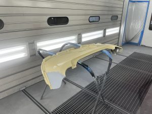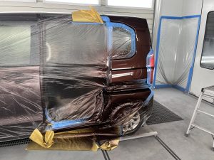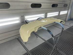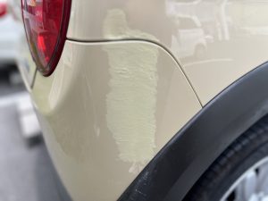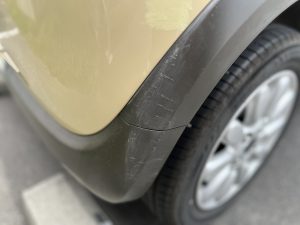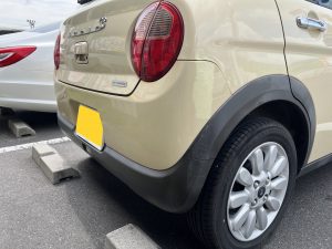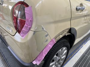 今回はリヤドアとクォーター、センターピラーの鈑金修理とリヤバンパーのタッチアップ作業を行いました。